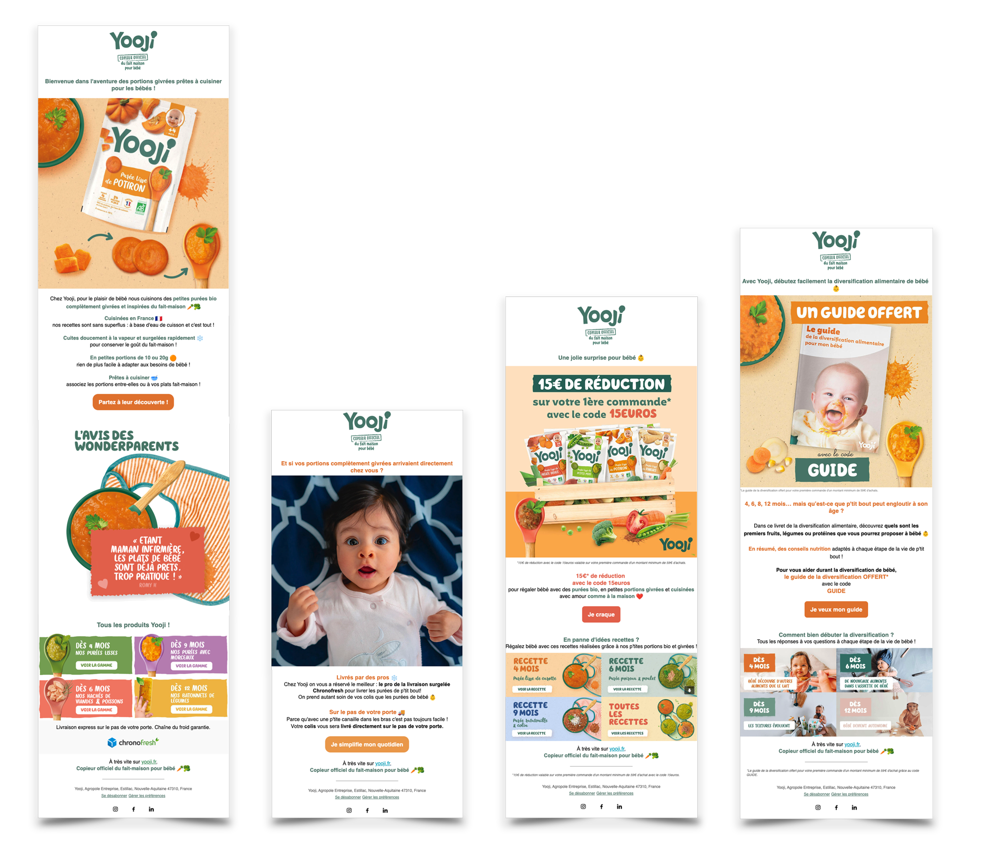 Rédaction et créations de newsletters pour la marque YOOJI, qui réinvente l’alimentation pour bébés avec ses petites portions surgelées.